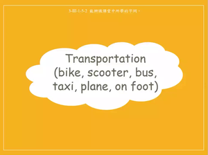 本影片所學為交通工具相關單字bike, scooter, bus, taxi, plane, on foot,以女孩思考上學時搭乘的運輸工具為情景,藉由交通工具其所發出的聲響和句型I ride ____.,讓學生認識相關字詞,例如女孩使用I ride a bike.表達騎腳踏車去學校, Ring-ring-ring.則是腳踏車所發出的鈴聲。影片的最後,讓學生根據交通工具的快慢排列出正確的順序以及根據圖片選出正確的字詞。
