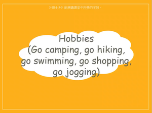 本影片所學為休閒活動相關片語go camping, go hiking, go swimming, go shopping, go surfing, go diving, go jogging,透過詢問不同朋友在閒暇時的興趣讓學生學會如何使用該片語,影片中所提及的句型包含:What do you like to do in your free time?及回應句 I go swimming in my free time.
