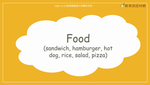 本影片所學為食物相關單字sandwich, hamburger, hot dog, rice, salad, pizza,以製作料理為情境,透過食物原料的組合讓學生猜測出正確的食物單字,例如:我們有麵包、肉和一些生菜。我們可以製作一個漢堡(We have a bun.We have some meat.We have some lettuce.