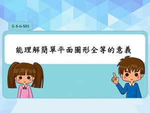 學習內容:S-4-6 平面圖形的全等:以具體操作為主。形狀大小一樣的兩圖形全等。能用平移、旋轉、翻轉做全等疊合。全等圖形之對應角相等、對應邊相等。