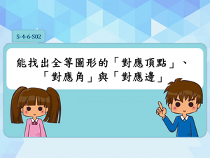 學習內容:S-4-6 平面圖形的全等:以具體操作為主。形狀大小一樣的兩圖形全等。能用平移、旋轉、翻轉做全等疊合。全等圖形之對應角相等、對應邊相等。
