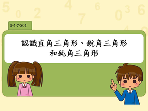 學習內容:S-4-7 三角形:以邊與角的特徵認識特殊三角形並能作圖。如正三角形、等腰三角形、直角三角形、銳角三角形、鈍角三角形。