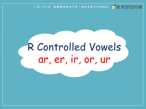 本影片所學為聽辨母音ar, er, ir, or, ur。其中ar的發音為[ar],or的發音為[ɔr],er, ir, ur發音相同為[ɚ]。影片中所使用的單字包含ar: star, marbles, shark,er: flower, tiger, spider,ir: bird, shirt, birthday,or: fork, horse, torch,以及ur: churh, turkey, turtle。