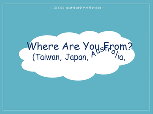本影片所學單字為國家。透過拜訪來自不同國家朋友,讓學生認識各國的英文名稱、國旗及著名景點。影片中提及的句子有Where are you from? I'm from ___.。學生學習的單字包含Taiwan, Australia, Egypt, the UK, the USA,影片中介紹的景點則有Mt. Fuji, Sydney Opera House, Egypt Sphinx, Big Ben, Statue of Liberty。