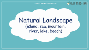 本影片所學單字為自然景觀,以臺灣的自然景觀為例,讓學生學習相關的單字如island, sea, mountain, river, lake, beach。使用的例句有Taiwan is a beautiful island located in East Asia./Taiwan is surrounded by seas./Mountain Jade is the highest mountain in Taiwan./Zhuoshui River is the longest river in Taiwan./Sun Moon Lake is the biggest lake in Taiwan./The beach in Kenting is the most beautiful beach in Taiwan./I like to go mountain climbing on weekends./I like swimming in the sea.。
