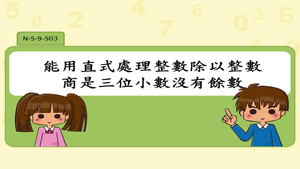學習內容:N-5-9 整數、小數除以整數(商為 小數):整數除以整數(商 為小數)、小數除以整數的 意義。教師用位值的概念說 明直式計算的合理性。能用 概數協助處理除不盡的情 況。熟悉分母為 2、4、5、 8 之真分數所對應的小數。