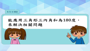 學習內容:S-5-1 三角形與四邊形的性質:操作活動與簡單推理。含三角形三內角和為 180 度。三角形任意兩邊和大於第三邊。平行四邊形的對邊相等、對角相等。