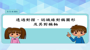 學習內容:S-5-4 線對稱:線對稱的意義。「對稱軸」、「對稱點」、「對稱邊」、「對稱角」。由操作活動知道特殊平面圖形的線對稱性質。利用線對稱做簡單幾何推理。製作或繪製線對稱圖形。