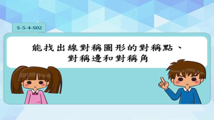 學習內容:S-5-4 線對稱:線對稱的意義。「對稱軸」、「對稱點」、「對稱邊」、「對稱角」。由操作活動知道特殊平面圖形的線對稱性質。利用線對稱做簡單幾何推理。製作或繪製線對稱圖形。