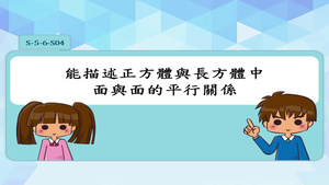 學習內容:S-5-6 空間中面與面的關係:以操作活動為主。生活中面與面平行或垂直的現象。正方體(長方體)中面與面的平行或垂直關係。用正方體(長方體)檢查面與面的平行與垂直。
