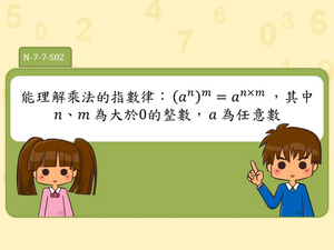 學習內容:N-7-7 指數律:以數字例表示「同 底數的乘法指數律」(am ×an = am+n、(am)n=amn、(a×b)n=an×bn,其中 m, n為非負整數);以數字 例表示「同底數的除法指數律」(am÷an= am-n,其中 m≥n 且m,n 為非負整數)。