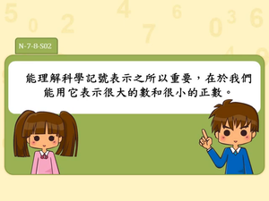 學習內容:N-7-8 科學記號:以科學記號表達正數,此數可以是很大的數(次方為正整數),也可以是很小的數(次方為負整數)。