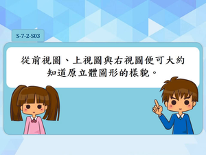 學習內容:S-7-2 三視圖:立體圖形的前視圖、上視圖、左(右)視圖。立體圖形限制內嵌於3×3×3的正方體且不得中空。