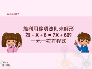 學習內容:A-7-3 一元一次方程式的解法與應用:等量公理;移項法則;驗算;應用問題。
