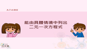 學習內容:A-7-4 二元一次聯立方程式的意義:二元一次方程式及其解的意義;具體情境中列出二元一次方程式;二元一次聯立方程式及其解的意義;具體情境中列出二元一次聯立方程式。