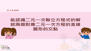 學習內容:A-7-6 二元一次聯立方程式的幾何意義:a+x=by=c 的圖 形; y=c 的圖形(水平 線);x=c 的圖形(鉛垂 線);二元一次聯立方程式的解只處理相交且只有一個交點的情況。