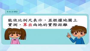 學習內容:S-6-2 解題:地圖比例尺。地圖比例尺之意義、記號與應用。地圖上兩邊長的比和實際兩邊長的比相等。