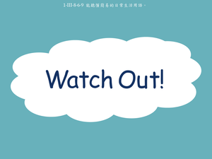 本影片所學為日常生活用語Watch out!,透過朋友之間的情境對話讓學生學習此用語的使用時機,並說明Watch out代表的意思為Be careful!。動畫中呈現的情景包含:過馬路時,Vivian提醒Jess小心,注意車子以及走路時,Chloe提醒Lena不要使用手機。