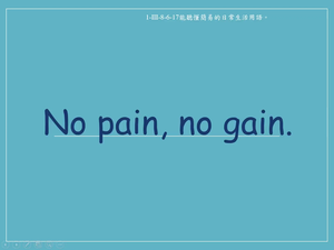 本影片所學為日常生活用語No pain, no gain.,透過小男孩不放棄練習足球及Shawn持之以恆練習做料理的情境讓學生學習此用語的意涵及使用時機。影片中使用相關的句子:I'm getting better every day./I'll keep practicing./He works hard and never gives up.