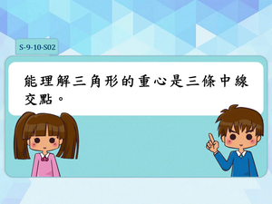 學習內容:S-9-10 三角形的重心:重心的意義與中線;三角形的三條中線將三角形面積六等份;重心到頂點的距離等於它到對邊中點的兩倍;重心的物理意義。