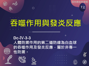 人體防禦作用的第二道防線為白血球的吞噬作用及發炎反應,屬於非專一性防禦。