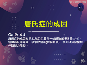 唐氏症的成因為第21號染色體多一條所致(俗稱3體生物),病徵為反應遲鈍、橫掌紋過長(俗稱斷掌)、臉部發育似猿猴、伴隨智力障礙。