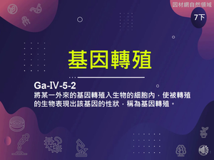 基因轉殖:將一段外源生物的基因轉入某生物體的基因內,讓該生物表現出外源基因的特徵,稱為基因轉殖。