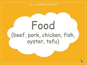 本影片所學單字為食物,透過在超市購物的情景及搭配句型This is _____.學習相關單字,如beef, chicken, pork, fish, oyster, tofu。此外,影片中也列舉臺灣的料理並讓學生找出當中所使用的食材,包含:beef noodles, chicken fillet, stewed pork rice, fish ball soup, oyster omelet, stinky tofu。