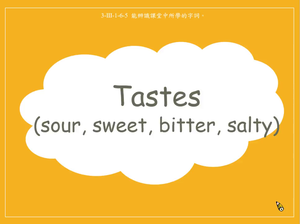 本影片所學單字為基本味覺,先介紹4個人類的基本味覺如sour, sweet, bitter, salty,再藉由句型及圖片進行學習。影片中使用的例句包含:The candy tastes sweet./The lemon tastes sour./The medicine tastes bitter. /The steak tastes salty.。