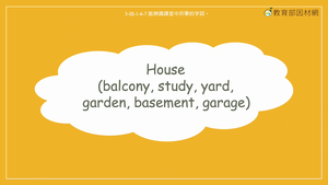 本影片所學單字為家中的房間名稱,透過老師介紹自己理想中房子學習balcony, study, garage, garden, basement, yard等字詞及房間的功能,並使用的例句:We can ___活動名稱___ in the __房間名稱__ ,來表示我們可以在這個房間裡從事的活動。例如:我們可以在車庫停車可以透過句子 “We can park cars in the garage.”來表示。影片中提及的活動單字包含:play with our friends, read, enjoy our time, plant some flowers, a nice storage (儲物) place.。影片的最後藉由描述房間的特徵,讓學生選出正確的房間名稱。
