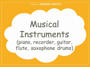 本影片所學單字為樂器。以才藝表演為主題並搭配句型Let's welcome _人_to play the__樂器__,讓學生學習相關單字。如:piano, recorder, guitar, flute, saxophone, drums。影片中所使用的例句:Let's welcome Lily to play the piano./Let's welcome Wilson to play the recorder./Let's welcome Ruby to play the recorder./。