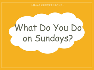 本影片所學為問句What do you do on Sundays?,以及回應句 I ____(休閒活動) on Sundays.。影片中透過不同的休閒活動圖片或動畫讓學生反覆練習句型。影片後段提供句子重組題及選擇題,協助學生複習所學內容。主題單字: go to English class, go shopping, go fishing, go camping, go mountain climbing, play baseball。