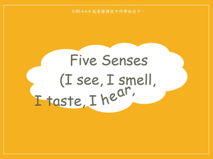 本影片所學句型為I _______(五官感受) with my eyes/nose/skin/tongue/ ears。透過動畫及圖片練習句型並學習描述五官的感受,例如I smell with my nose.The coffee smells great.。影片後段提供圖片與敘述配合題及填空題,協助學生複習所學內容。主題單字: see, smell, feel, taste, hear。