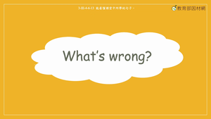 本影片所學為問句What's wrong?及回應句I have a ____ (病症).和My/His/Her ____ (身體部位) hurt(s)。以醫院為背景,透過醫生與患者之間的對話,讓學生學習句型。影片後段提供句子填空及選擇題,協助學生複習所學內容。主題單字:headache, fever, runny nose, leg, foot, eye(s)。