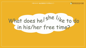 本影片所學為疑問句What does he/she like to do in his/her free time?及回應句 He/ She likes to _____ (休閒活動) in his/her free time.。透過男孩詢問班上同學空閒時間喜愛從事的休閒活動,讓學生學習句型。影片後段提供句子填空及選擇題,協助學生複習所學內容。主題單字:go camping, go shopping, play basketball, lisen to music, watch TV。