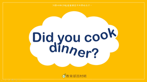 本影片所學句型與日常生活有關。藉由對話學習句型Did you _____?及回應句Yes, I did./No, I didn't.。再透過表格,練習此句型。影片中使用的單字包含:cooked dinner, cleaned the table, washed dishes, did homework, walked the dog, did the laundry。