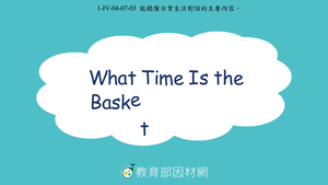 本影片所學對話內容為What Time Is the Basketball Game?,藉由Lena與Chloe之間的對話協助學生學習。影片分為兩個部分幫助學生學習。首先,讓學生理解對話內容,從對話中可以得知Lena邀請Chole一同去觀賞籃球比賽,但Chole在5點後有預約牙醫,因此最後她們選擇去觀看兩點的比賽。此外,她們也安排在11點30分的時候與Emily一同吃午餐。接著,2點再到籃球場支持Emily比賽。透過練習題來協助學生檢視他們對會話內容的理解程度。