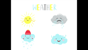 本影片所學單字為天氣(Weather),包含:sunny, cloudy, rainy, snowy。透過圖片及例句解釋字詞,協助學生了解單字的意思。最後,利用練習題讓學生辨認所學字詞。