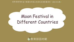 本影片主題為Moon Festival in Different Countries,讓學生認識臺灣(Taiwan)、韓國(Korea)、日本(Japan)及越南(Vietnam)中秋節傳統習俗,進而能比較不同國家的文化差異。以及,在影片結尾時透過練習題協助學生複習所學內容。