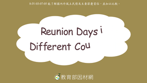 本影片主題為Reunion Days,讓學生認識並比較不同國家的團圓日(Reunion Days)。在西方或是東方國家的慶祝日期與方式皆不進相同。在臺灣及中國人們團圓的節慶有中秋節(Moon Festival)、農曆新年(Lunar New Year),在美國則有感恩節(Thanksgiving)以及聖誕節(Christmas)。在美國,人們通常會一起享用晚餐,餐點包含烤雞(Roasted Turkey)、馬鈴薯泥與(Mashed Potatoes with Gravy)、蔓越莓醬(Cranberry Sauce)、南瓜派(Pumpkin Pie)以及蘋果派 (Apple Pie)或是其他甜點。此外,影片中也分別比較美國與加拿大的感恩節日期,美國是在11月的第4週的週四,而加拿大的感恩節則是在10月的第二個星期一。在臺灣,每年餐桌上的餐點會有特殊的涵義例如年年有餘、好彩頭、食雞,會起家等。至於中秋節,人們則會有烤肉(Have a Barbecue)、吃柚子、月餅(Pomelos and Mooncakes)&以及祭拜祖先(Worship Ancestors)等活動。影片最後,設計練習題,協助學生能複習所學內容。議題相關:多元文化、國際教育。