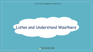 本影片所學為天氣(Weathers)相關單字,首先透過圖片介紹天氣的單字-sunny, rainy, snowy, windy, cloudy, lightning, stormy, foggy, cold, hot。再讓學生聆聽臺灣的天氣預報,並能回答出各個城市的天氣或是根據天氣選出人物所在的城市,例如 It's sunny in Changhua./It's windy in Hsinchu.。/She's in Yilan. It's stormy today.。影片最後利用聽力練習題,讓學生能聽辨本單元所學字詞。