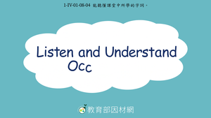本影片讓學生學習聽懂職業(Occupations)相關單字。影片中說明職業所透露的資訊包含可以從人們的工作場所、職稱得知一個人的工作和她的職位內容,例如醫生(doctor)和護士(nurse)在醫院工作 ,老師(teachers)在學校裡工作;歌手負責唱歌(A singer sings songs.),服務生負責服務(A waiter waits tables.)等。影片最後利用聽力練習題,讓學生能聽辨本單元所學字詞。影片中介紹的職業包含:A hairdresser works in a hair salon. /An office worker works in an office. /A dancer dances to music./A magician does magic tricks./A driver drives a vehicle./ A fisherman catches fish./ A firefighter fights fire./A dentist fixes dental problems./A teacher teaches knowledge to students.。