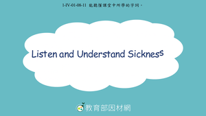 本影片所學為疾病名稱(Sicknesses),透過不同的圖片與動畫情境帶領學生認識,先分別介紹疾病名稱(Sickness)與症狀(Symptoms)分別代表的意思,影片中藉由cold 來說明sickness是指a state of being ill health的意思而symptoms則表示the signs or the feelings indicating the sickness,像是dizzy與fever。此外,影片中也比較並說明感冒(a cold)與流感(flu)的差別,兩者皆是由病毒所引起的,但流感比感冒嚴重。影片後段設計練習題,讓學生根據選出正確的症狀。