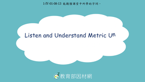 本影片所學為國際單位制(Metric Units),帶領學生認識常見的單位以及不同單位間的換算。影片開頭先介紹Metric Units的意涵為用於描述物品長度(Length)、寬度(Weight)以及容量(Volume)的單位。接下來依序介紹屬於長度的單位有Meter, Centimeter, Kilometer,並說明不同單位間的換算,例如1 meter=100 centimeter, 1000 meters=1 kilometer。此外,也補充說明cent-代表100, 1/100以及kilo-表示1000。重量單位包含Gram以及 Kilogram,其中1000 grams=1 kilogram。最後介紹Liter, Milliliter是容積單位。介紹完常見的單位後,透過表格協助學生複習所學內容,並安排聽力練習題讓學生選出正確的單位及代號。
