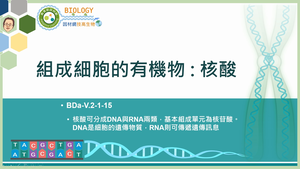 核酸可分成DNA與RNA兩類,基本組成單元為核苷酸。DNA是細胞的遺傳物質,RNA則可傳遞遺傳訊息
