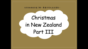 本影片所學為紐西蘭的聖誕節(Christmas in New Zealand),紐西蘭人喜歡在午餐進行燒烤,食材包含火腿切片、鹿肉、蝦子和其他魚類,晚餐時會在餐桌上放禮炮,禮炮裡面會放些小東西,像是小玩具、便條紙或是有趣的笑話。影片最後透過練習題讓學生熟悉所學內容。議題相關:多元文化教育。