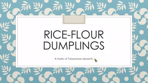 本影片所學為Taiwanese Dessert。影片介紹臺灣傳統小吃湯圓(元宵)。在元宵節及冬至人們分別會吃元宵和湯圓,英文有很多種說法例如:rice-flour dumplings、rice balls、sticky rice balls、glutinous rice balls、rice dumplings。湯圓有很多種口味,例如:Rice balls in rice wine soup(酒釀湯圓)、peanut rice ball soup、red bean rice dumpling soup、sesame rice ball soup、Taiwanese dumpling soup、meat rice dumpling soup。當我們要介紹湯圓時,可以從滋味、口感、食材、烹飪法及外觀來向他人介紹。湯圓的成分包含糯米粉、紅糖、油、餡料、高湯、甜湯。在冬至吃湯圓表示長了一歲以及闔家團圓樂。議題相關:多元文化教育。