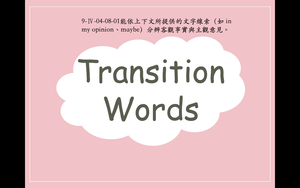 本影片所學為Transition Words(轉承詞),影片先說明Transition Words的定義為phrases or words used to connect one idea to the next(用於連接兩個想法的片語或詞彙),並將其分類為:Addition(補充)﹑Compare and Contrast(比較), Time(時間), Example(舉例), Cause and Effect(因果), Summary and Conclusion六種,接著說明在不同分類中包含的用詞。
