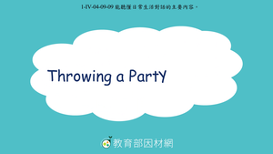 本影片所學對話內容為Throwing a Party or Not?,以Eric想要替結束美國打工度假的女友Lucy舉辦派對為情境。影片分為兩個部分幫助學生學習,先讓學生了解對話內容主題為歡迎Lucy回臺灣的派對,並能從對話中得知派對預定的舉辦時間與派對的大小類型。最後,透過練習題來協助學生檢視他們對會話內容的理解程度。