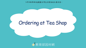 本影片所學對話內容為Ordering at Tea Shop,以Amy與飲料店店員(tea shop clerk)之間的對話為情境。影片分為兩個部分幫助學生學習,先讓學生了解對話內容的主題,並能從對話中得知茶飲的名稱、奶茶的種類、飲料容量大小(例如medium or large)、甜度(例如light sugar)與冰塊(例如regular ice)的表達方式。最後,透過練習題來協助學生檢視他們對會話內容的理解程度。